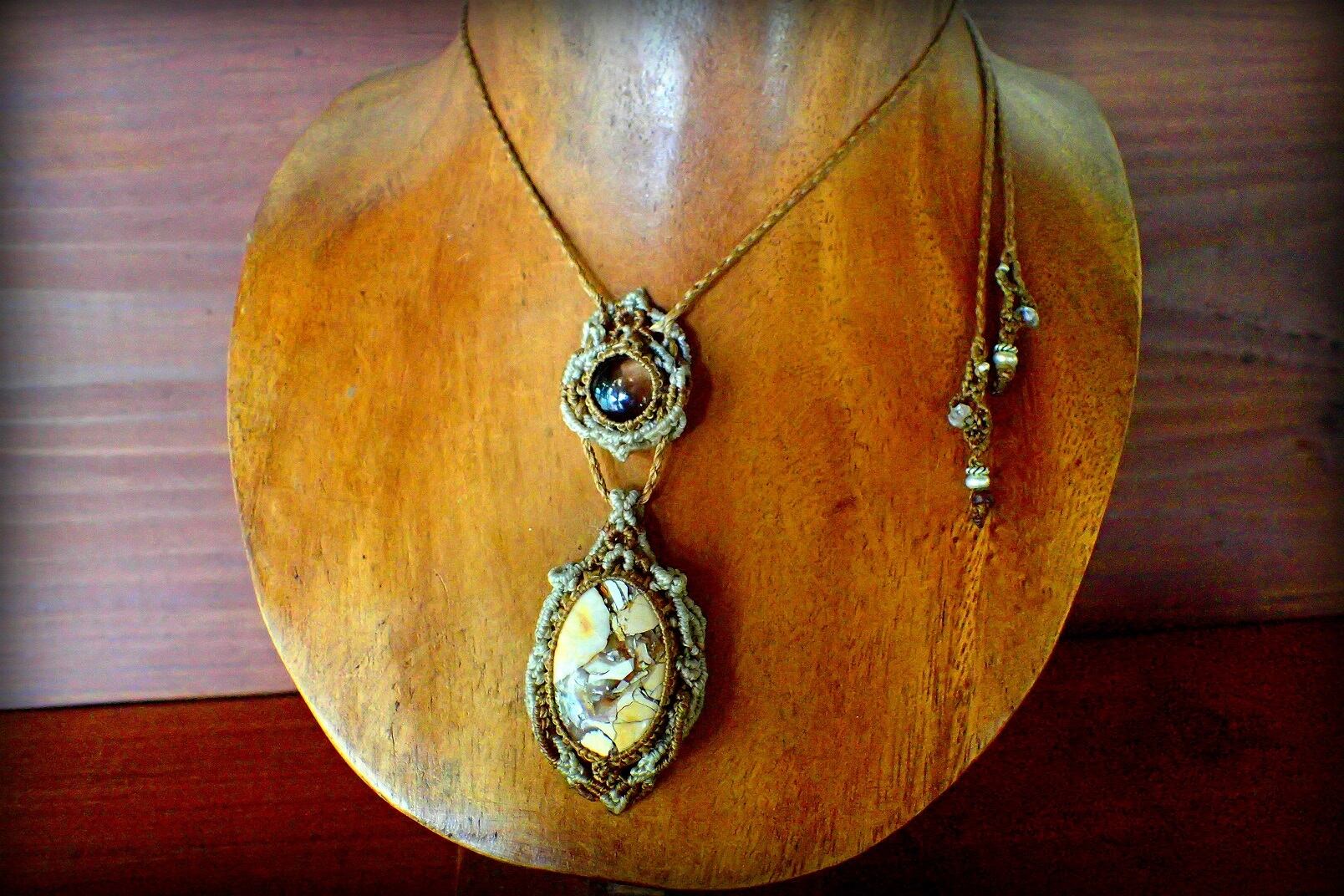 芸術的な絵画のような自然が作り出した模様が美しく、色合いもほっとさせてくれる優しいトーンがすてきなピクチャージャスパーと、首紐をスライドできるようにし、2連のペンダントであったり、首元まであげてチョーカータイプにも使えるようにマクラメ装飾したスモーキークォーツのペンダントです。