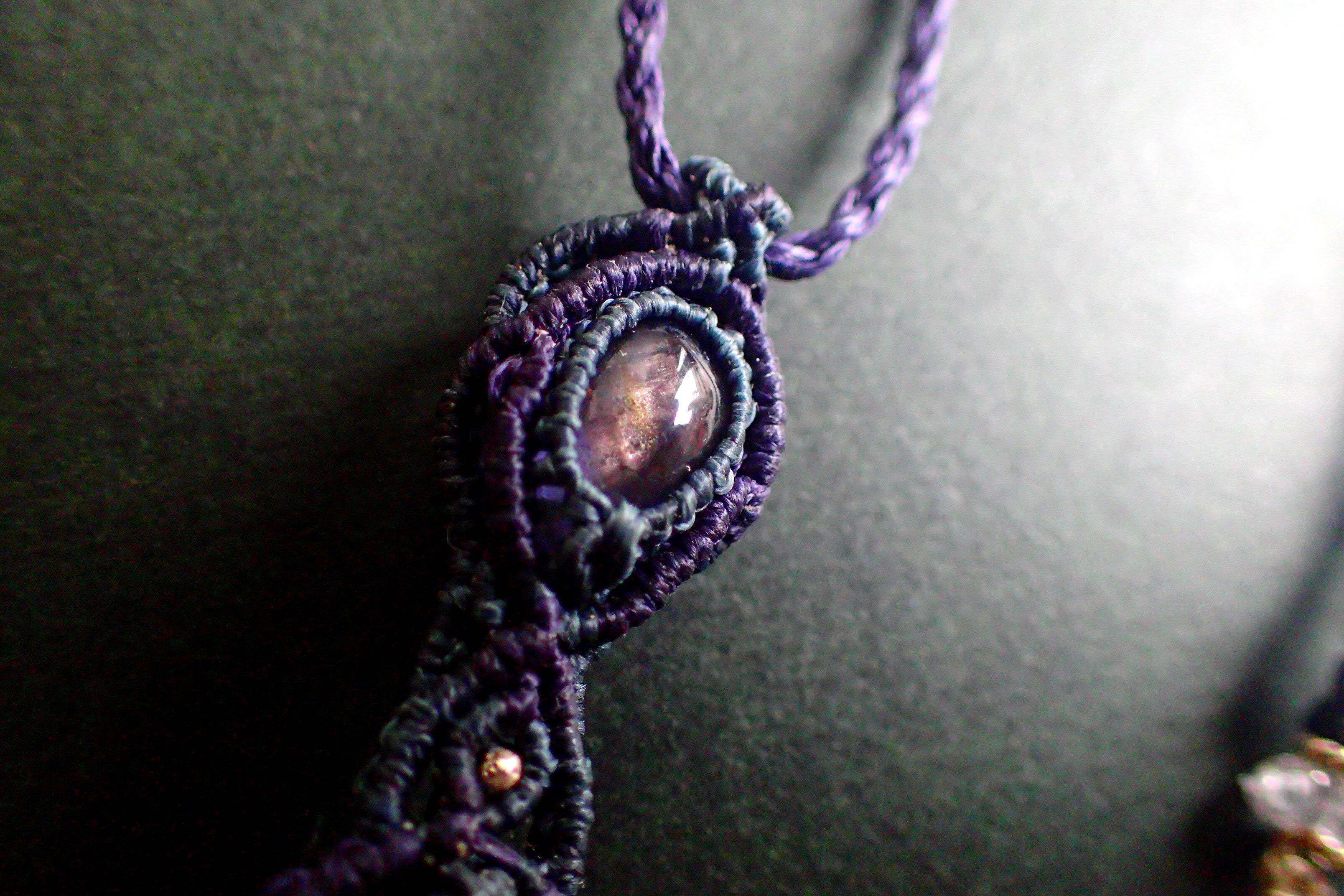 ヘマタイト付きクォーツ、アイオライトサンストーンマクラメデザインペンダント