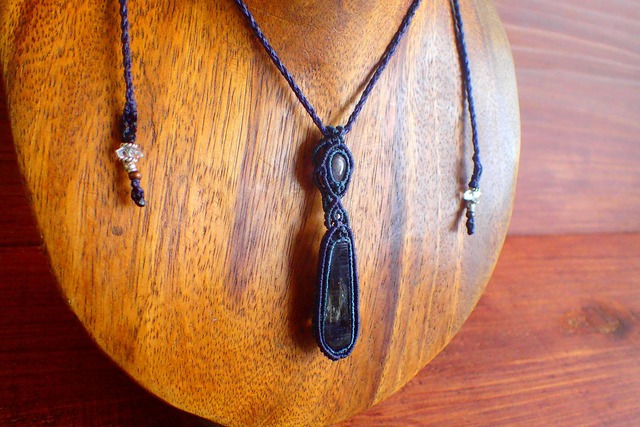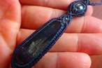 きらきらと青黒く光るヘマタイトが、透き通るきれいなクリスタル(水晶)に張り付いた水晶と、光の反射できらりと光り、光を通すとすみれ色のアイオライトサンストーンを、マクラメ装飾したペンダントです。
