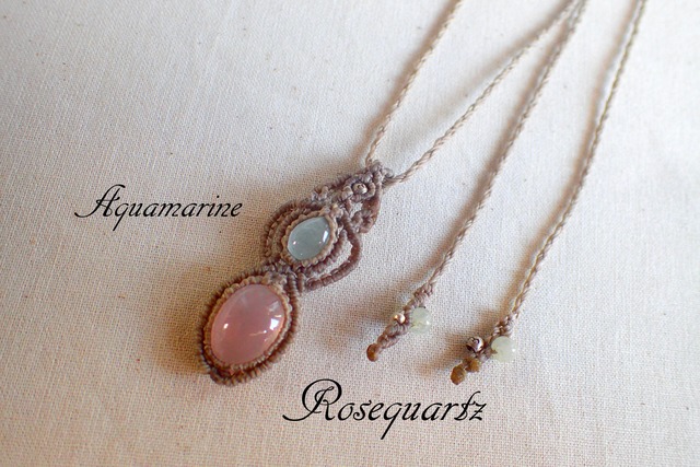 K2ブルーと呼ばれるこの石は、その名前の通りカラコルム山脈にある山・K2より採掘された、白地をベースに黒色の斑模様が浮かび、さらにそこに入り込んだ鮮やかな青のスポットが魅力的な色彩を付け加えた石をマクラメ装飾したペンダントです。