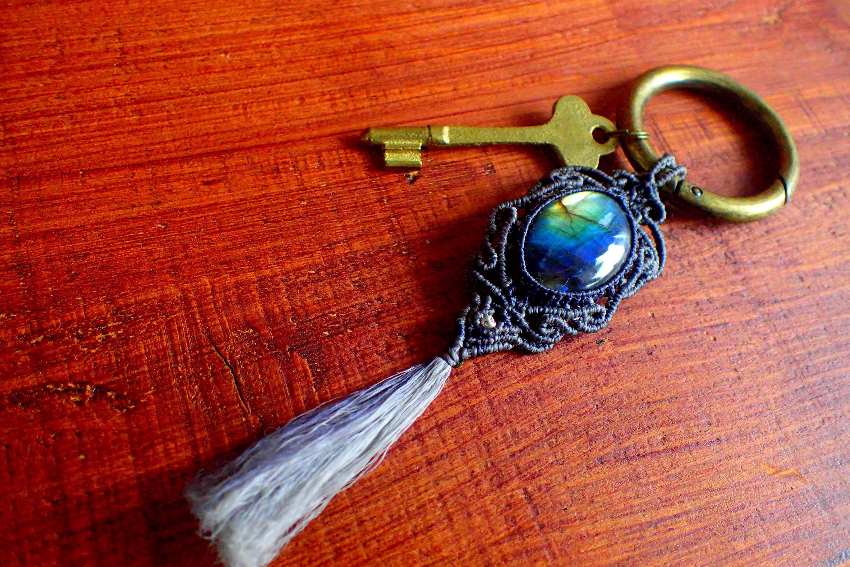 ラブラドライト、真鍮カラビナのマクラメキーホルダー