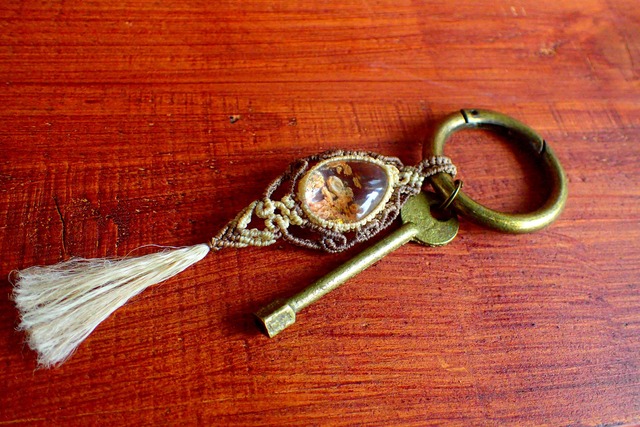 を、真鍮の丸型のカラビナにマクラメで付けたキーホルダーです。