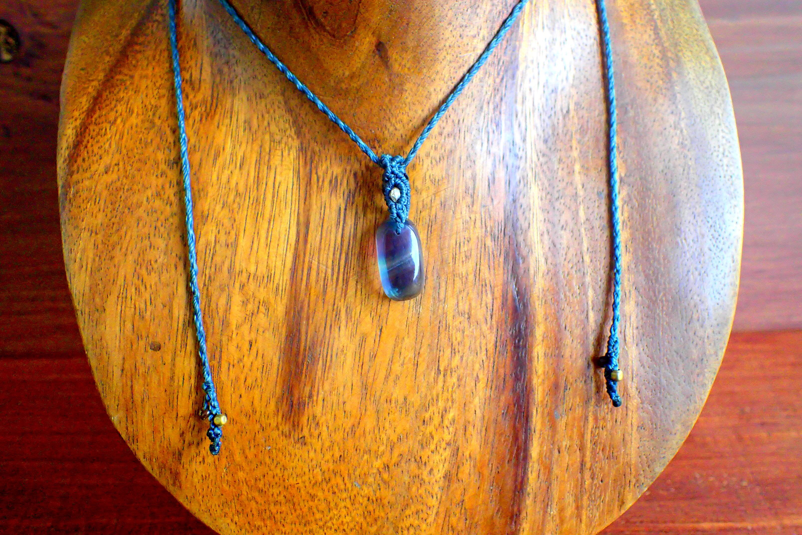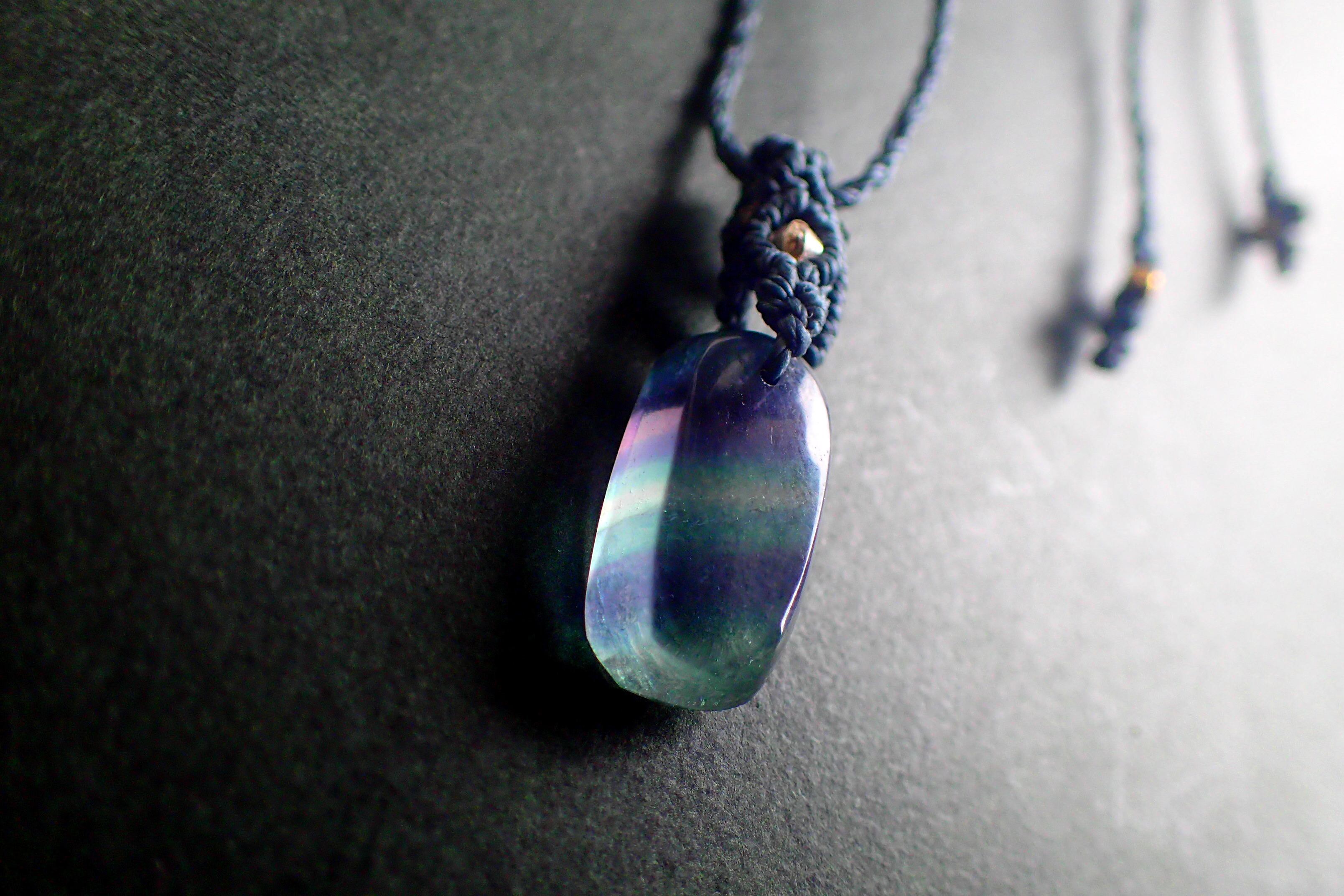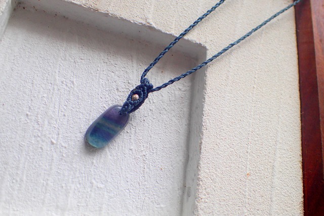 ブルーとパープルのストライプのきれいなフローライトに穴をあけ、マクラメでデザインペンダントに致しました。