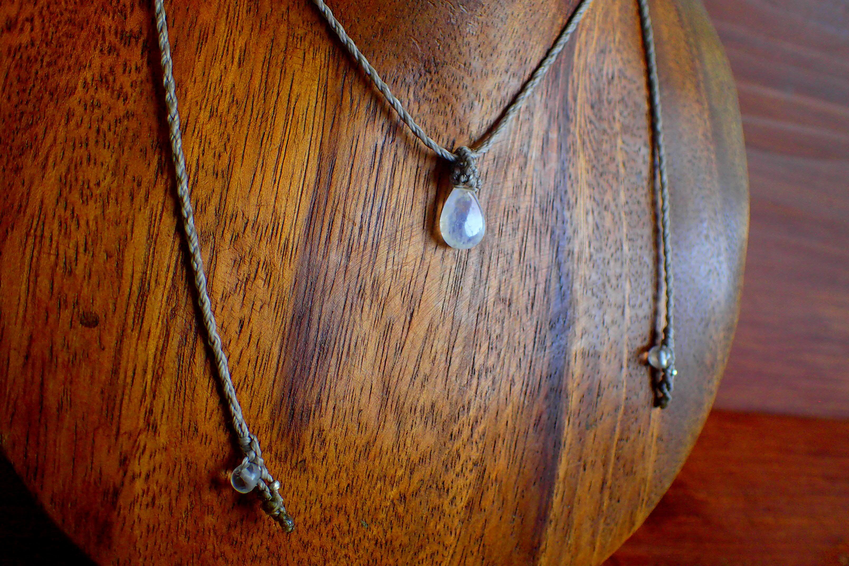 月の光の反射を映しているかのようなきれいな青い光をまとうレインボームーンストーン(ホワイトラブラドライト)をマクラメデザインペンダントです。