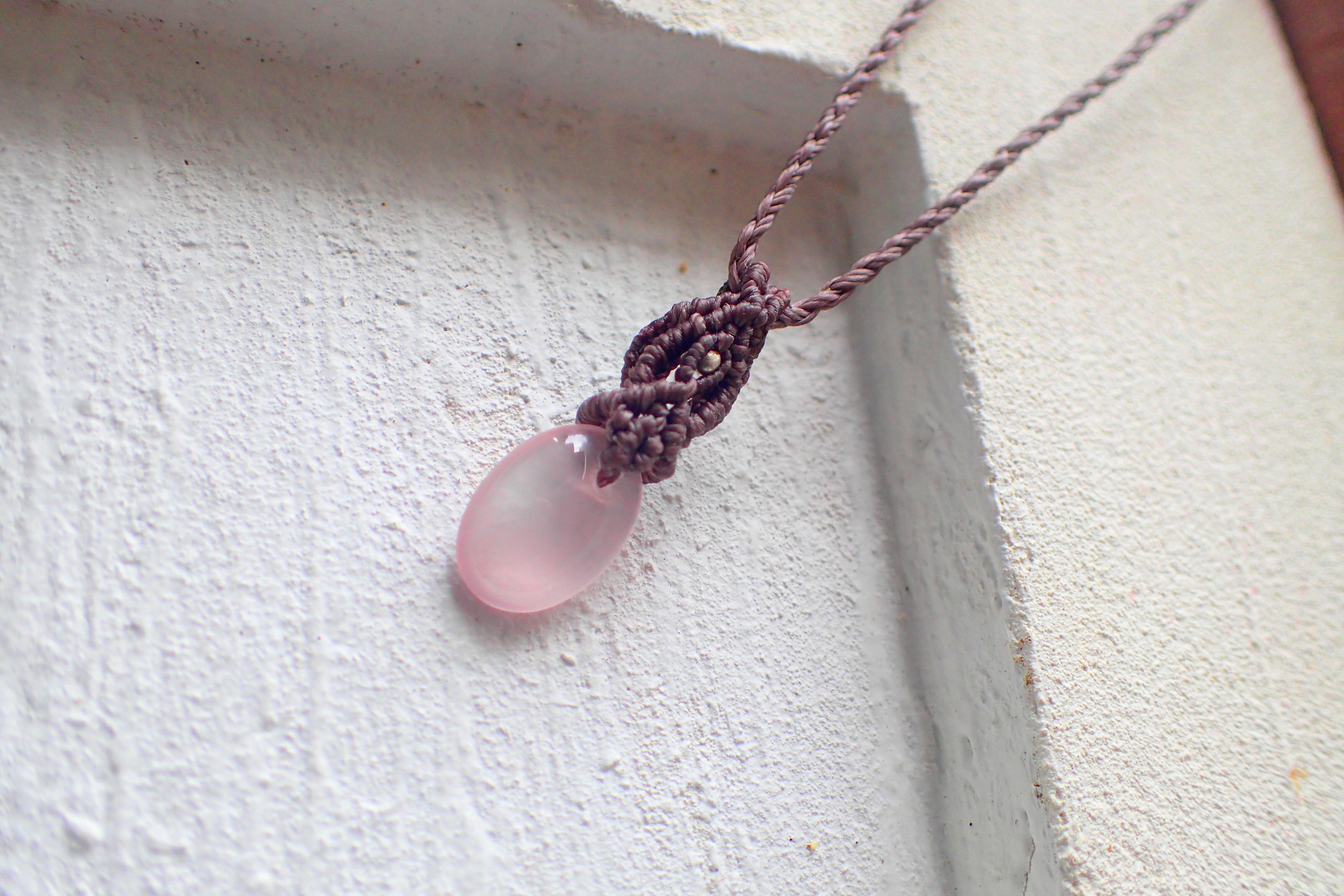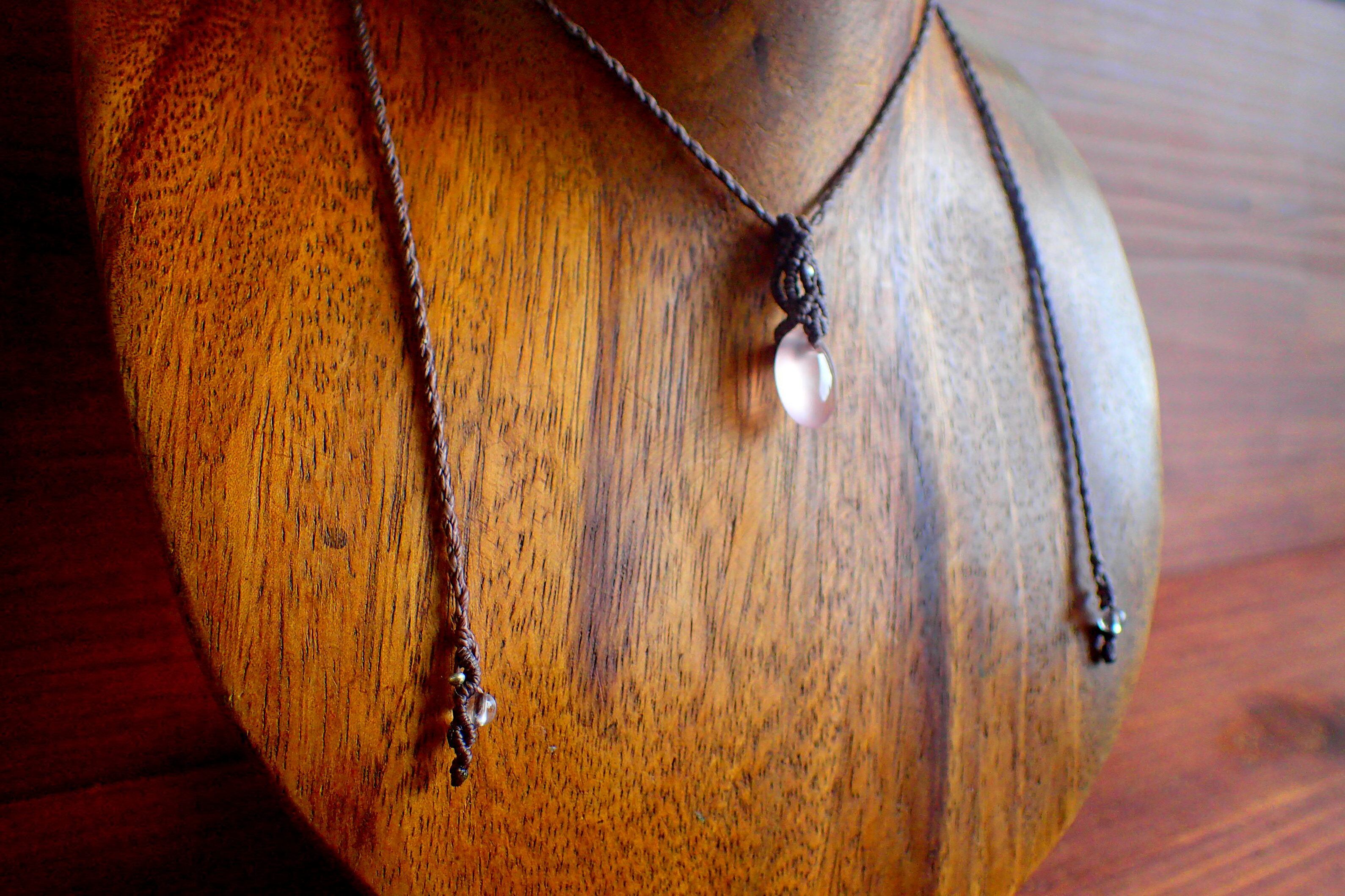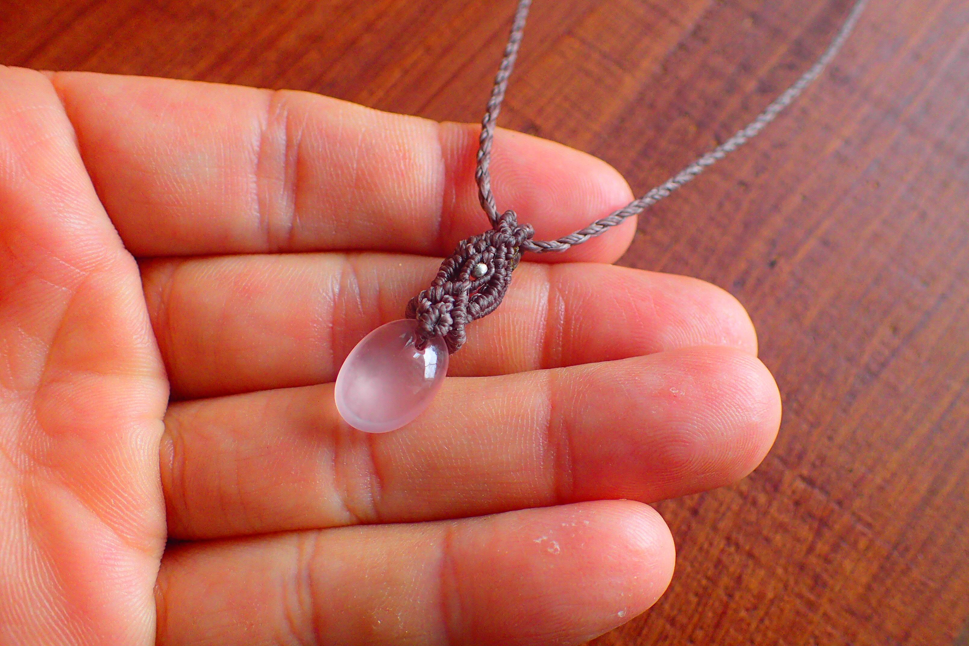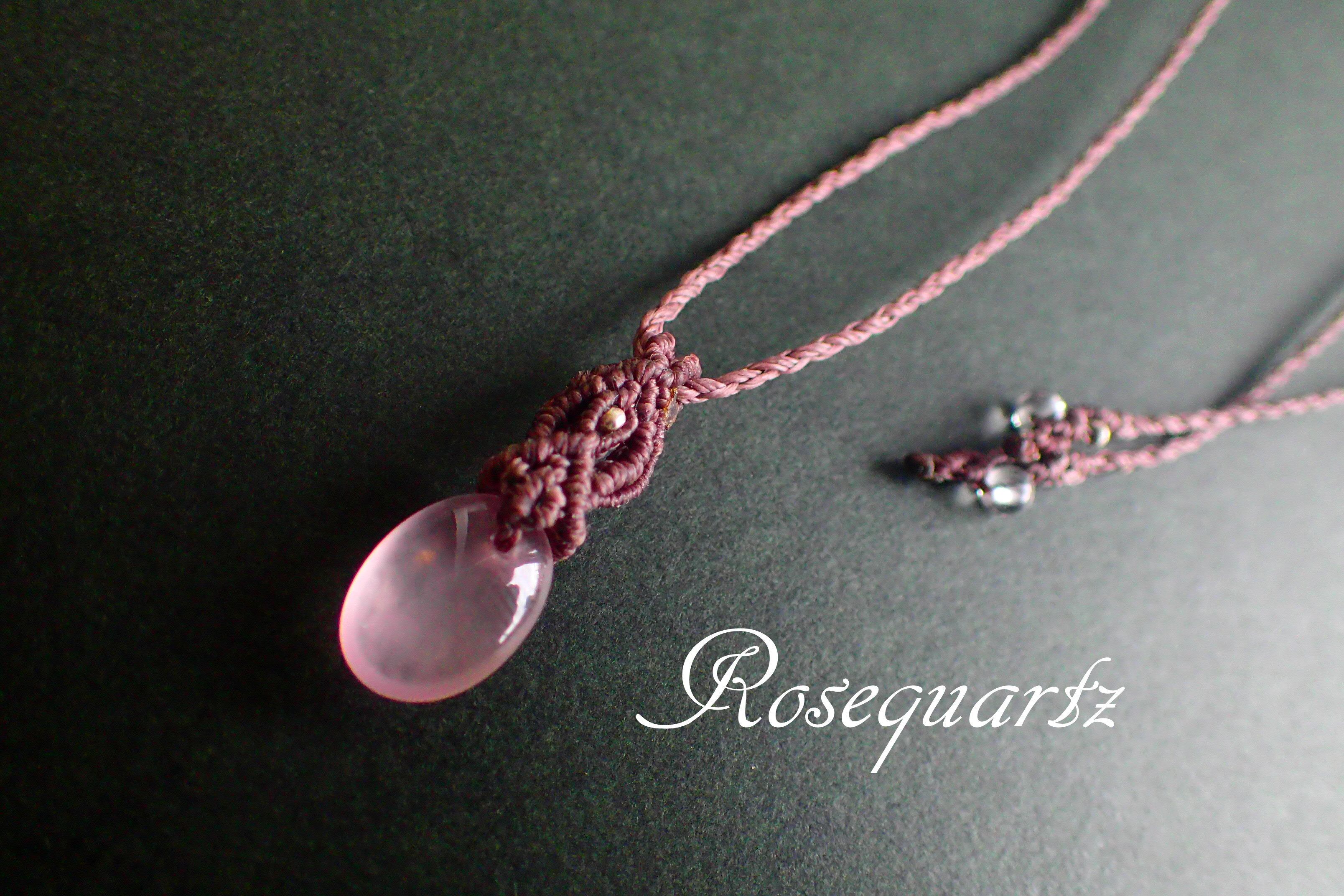優しい淡いピンク色で、内包物のないローズクォーツをマクラメ装飾を施したデザインペンダントです。