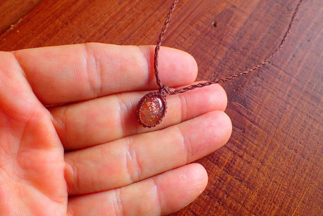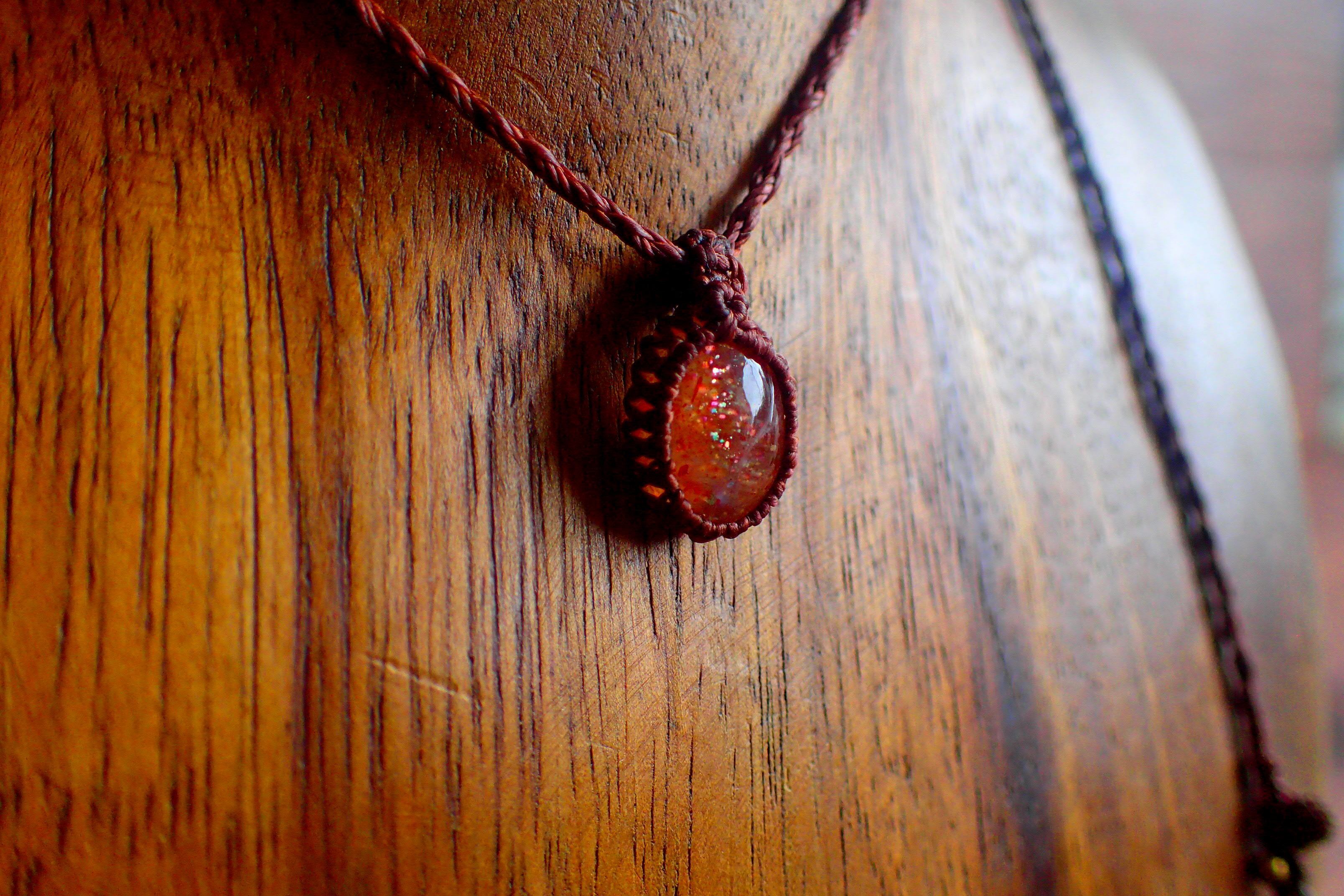 オレンジ色の光をきらきらと反射させる、ぬくもりのあるサンストーンをシンプルなマクラメペンダントです。