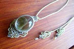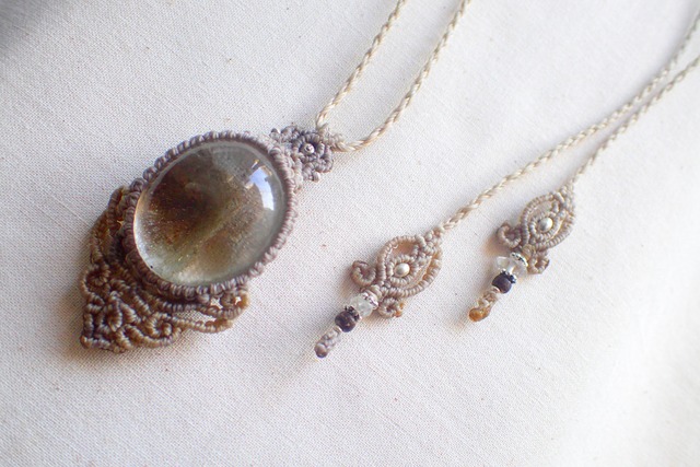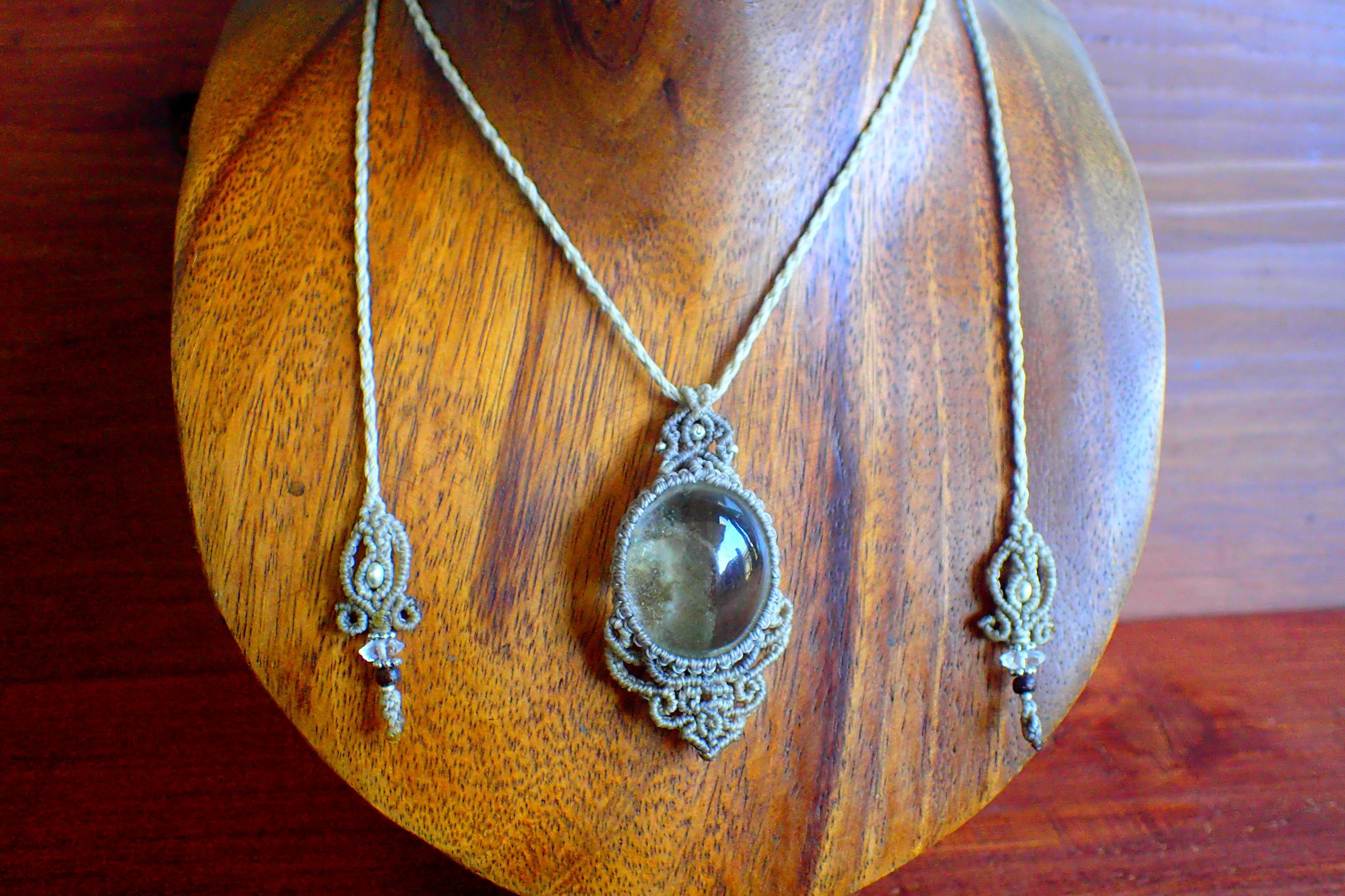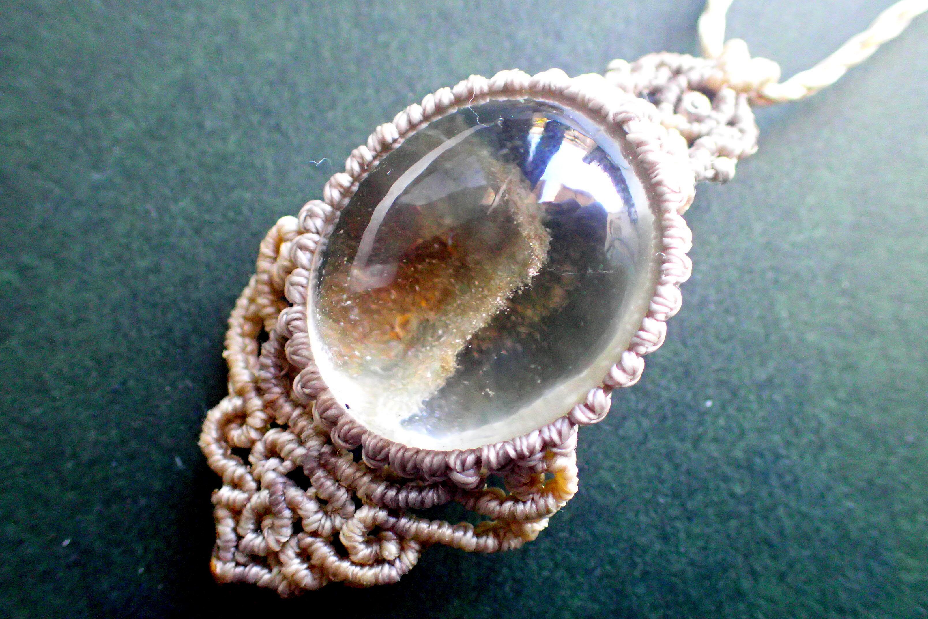 丸みのあるポリッシュが特徴的なミャンマー産ガーデンクォーツの中にファントム(幻影水晶)と呼ばれる内包物のある水晶を、エレガントなマクラメ装飾したペンダントです。
