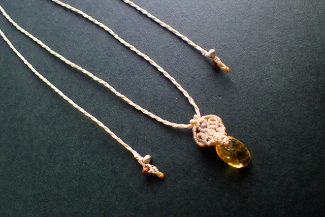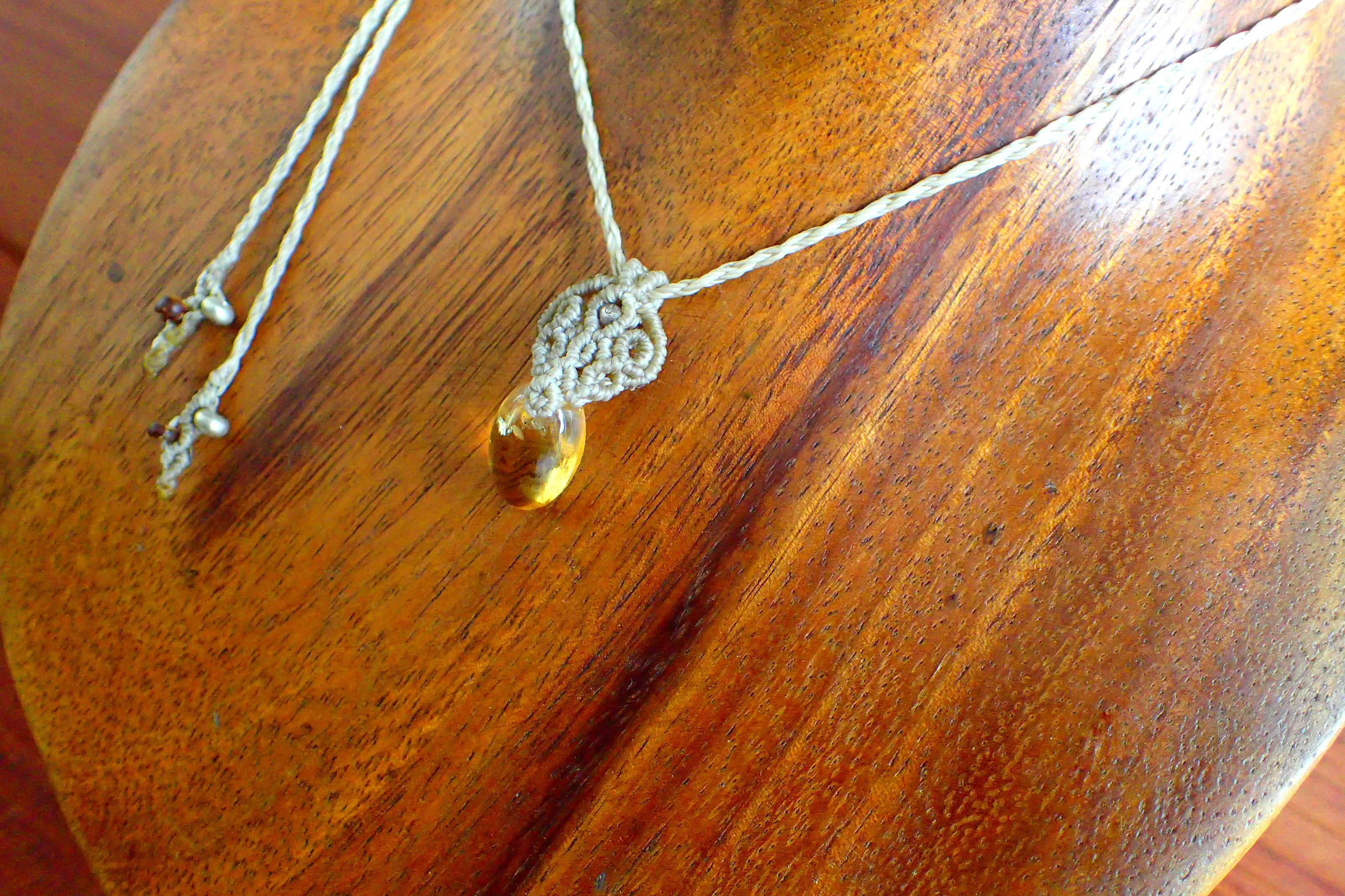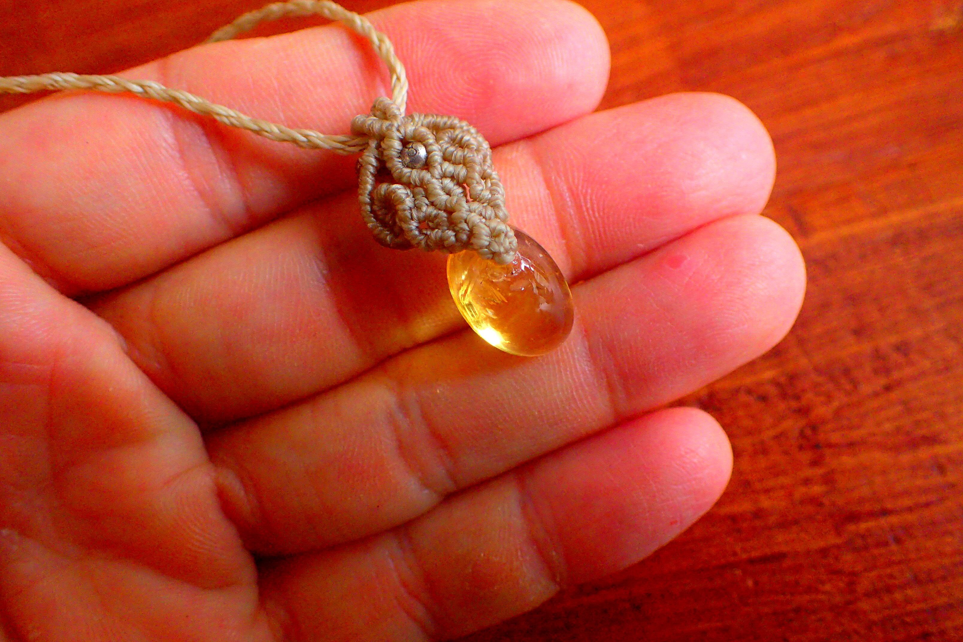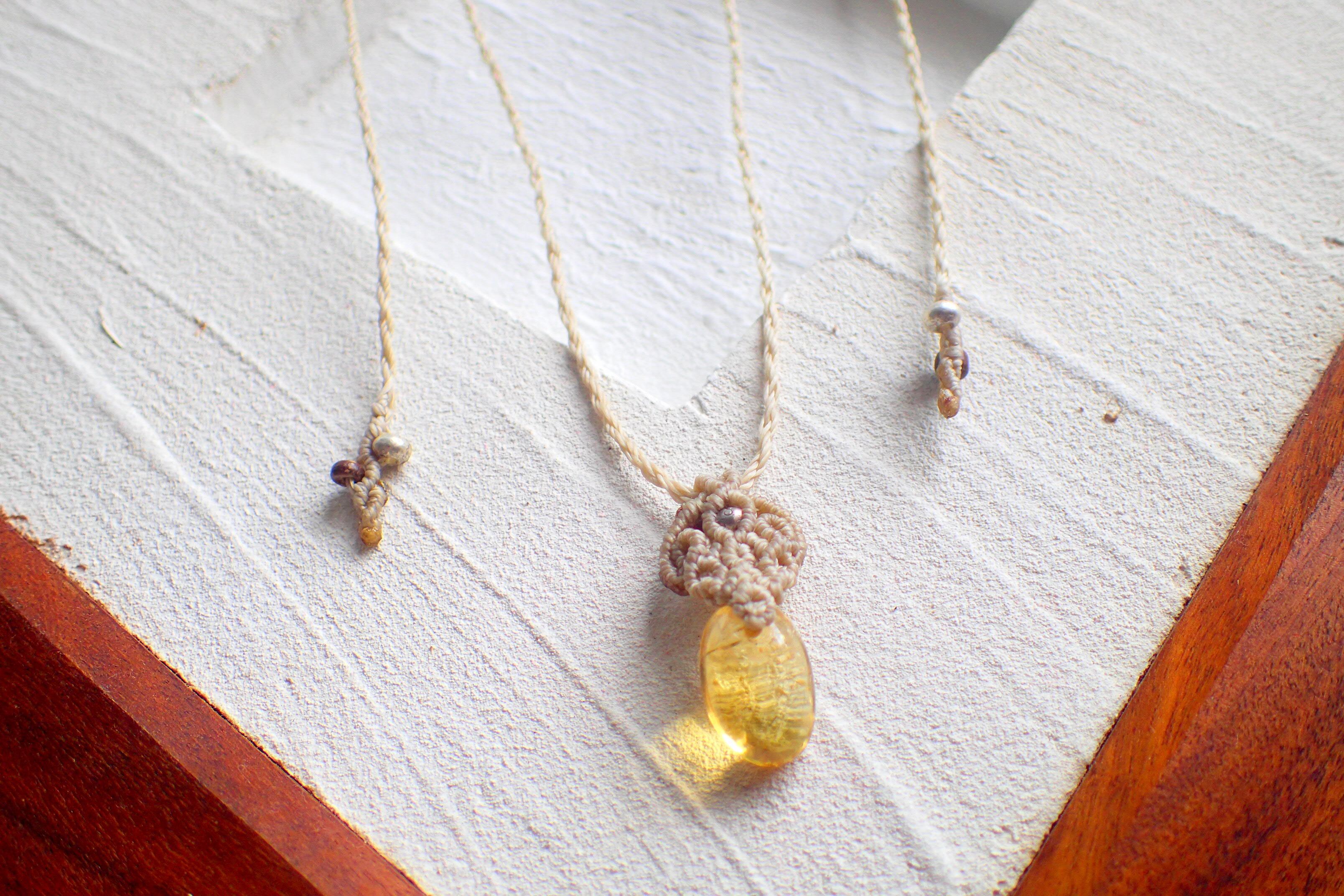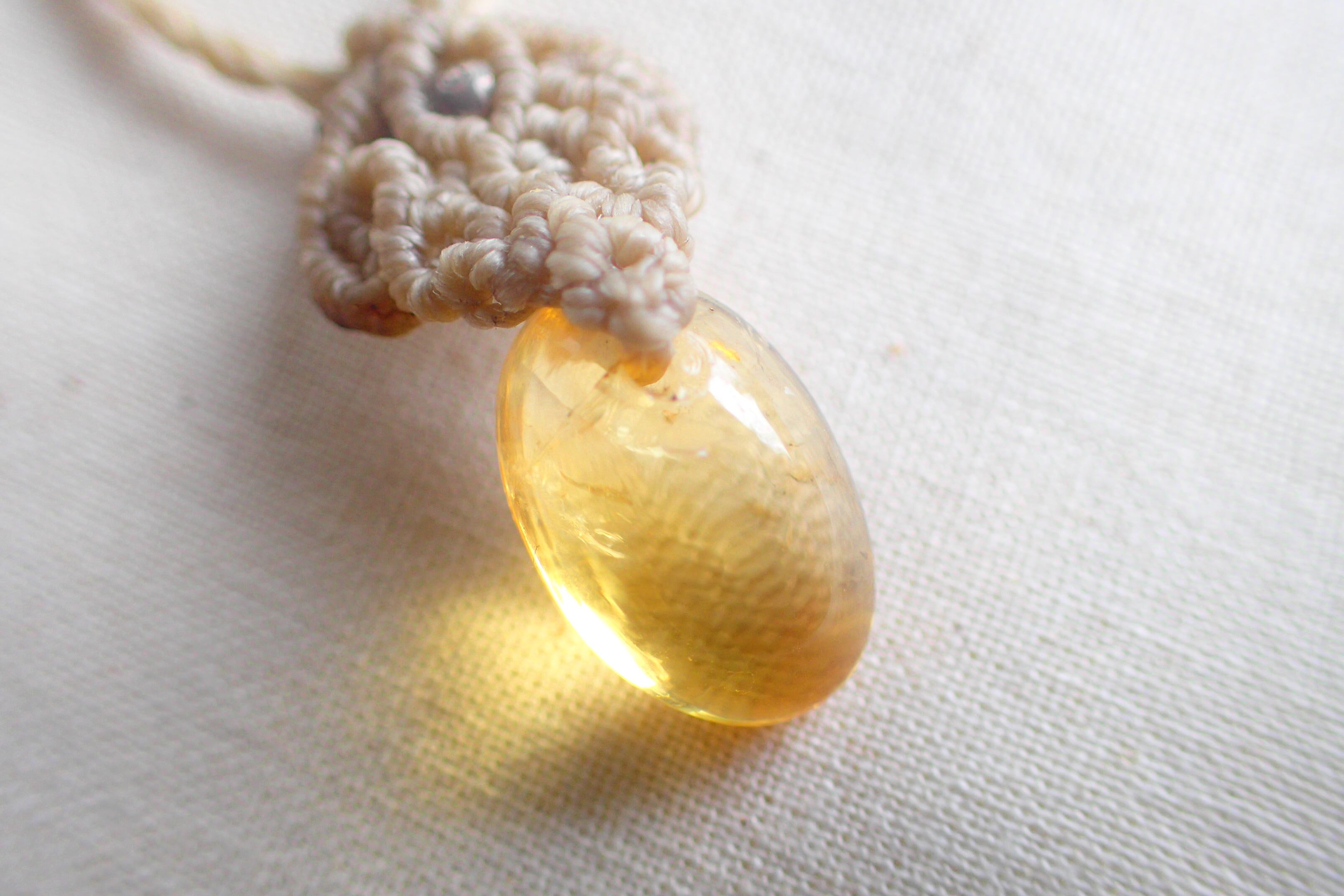 かわいらしく明るい、繁栄や幸福、幸運の象徴である透き通った黄色が特徴のシトリンを、全面的に見えるよう穴を空けてマクラメ装飾し、シトリンの明るさがよりはっきり見えるように仕上がりました。