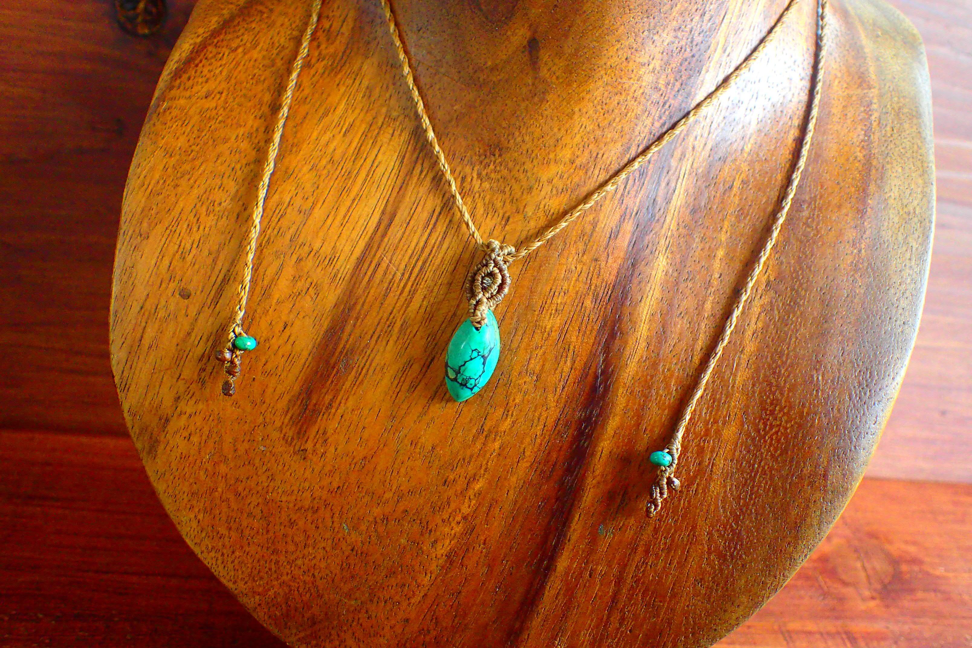 地に足をついた、自然のニュートラルな感じにさせてくれる緑色のチベタンターコイズのシンプルなマクラメペンダントです。小ぶりで使いやすいアイテムだと思います。