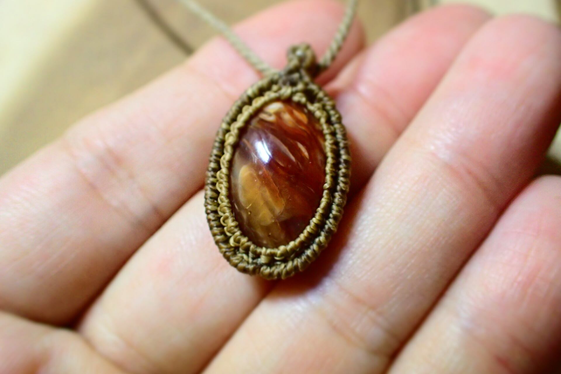 赤茶のオパール化した質感があり、光が当たると一筋の遊色が見られ、とても個性的な風合いをまとったペルー産のウッドオパールです。
