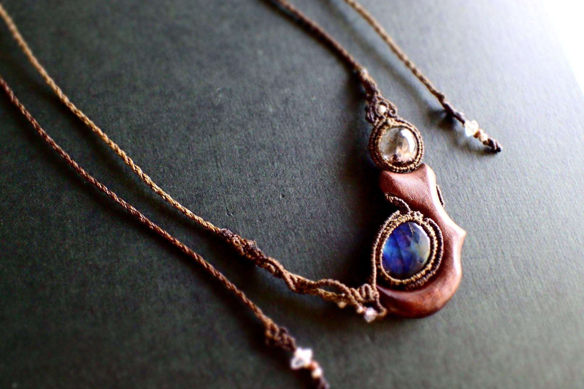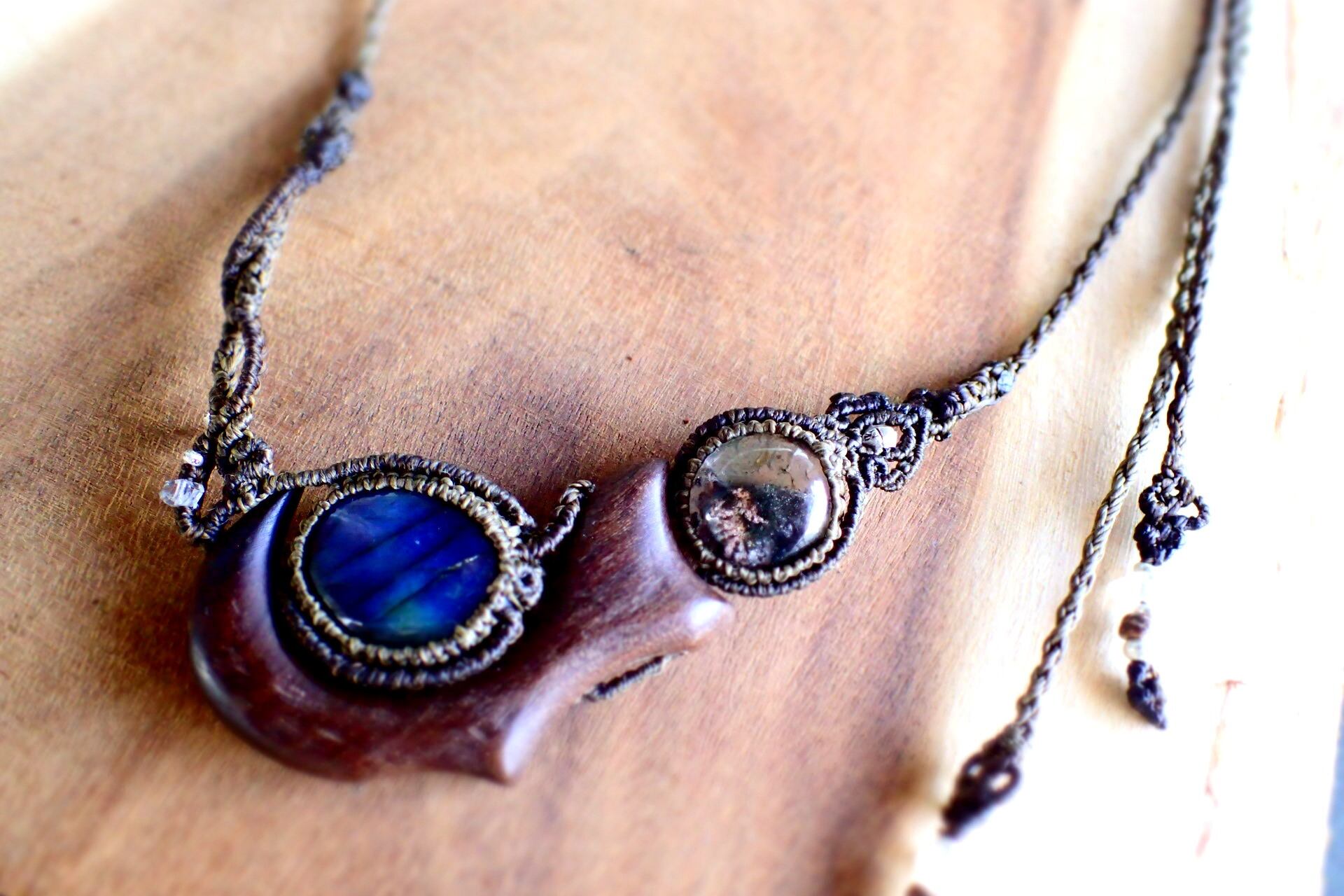 光の反射できれいな深い青色が浮かび上がる(ラブラドレッセンス)が美しいラブラドライトに合わせて、照りのある茶黒の木肌の風合いがある紫檀をフィッシュフックの形にカットし、バランスよくネックレスのトップにして、クローライト(緑泥)のファントムが入ったガーデンクォーツも合わせて、アシンメトリーデザインにマクラメネックレス仕立てました。