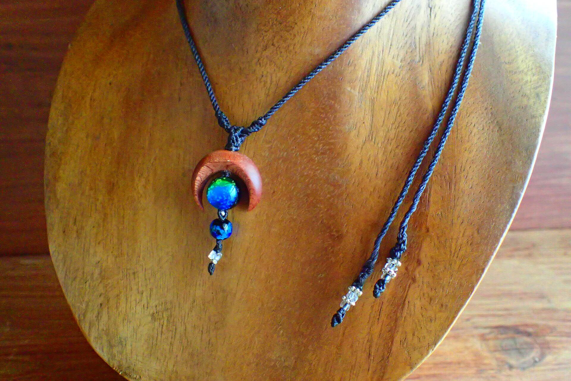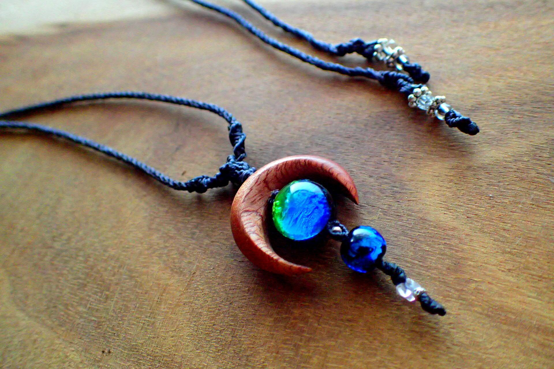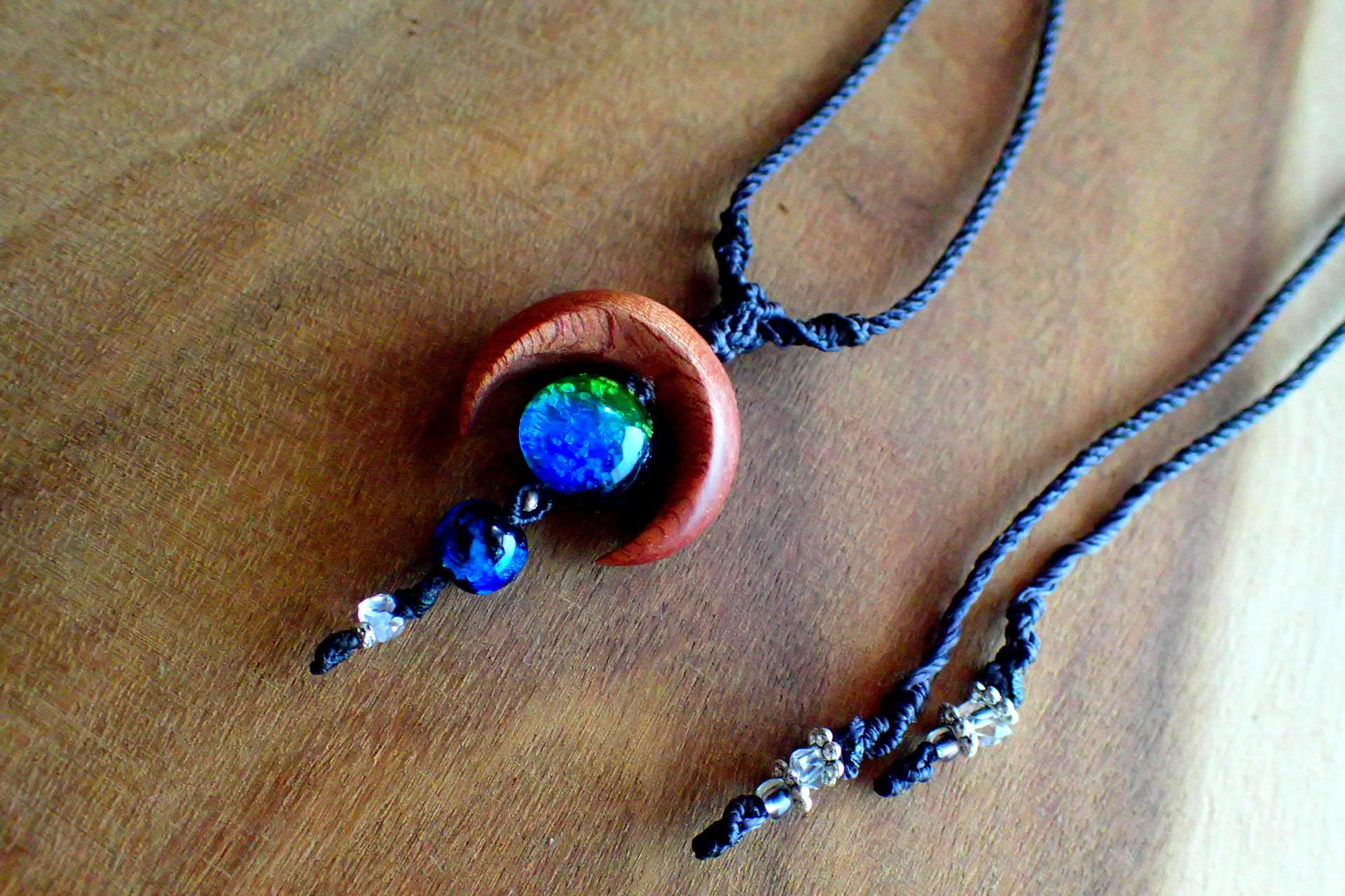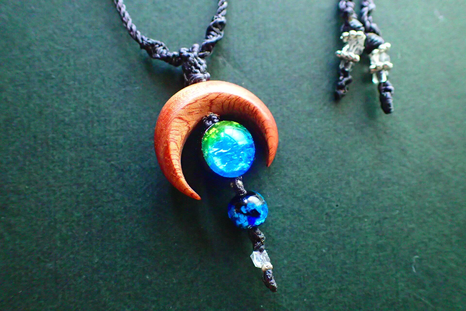 光を吸収して暗闇で光るように蓄光塗料が散りばめられている、沖縄で作られているガラス細工の蛍ガラスを二つと、テリハボク(やらぶ)を三日月形に作ったパーツを合わせたマクラメペンダントです。