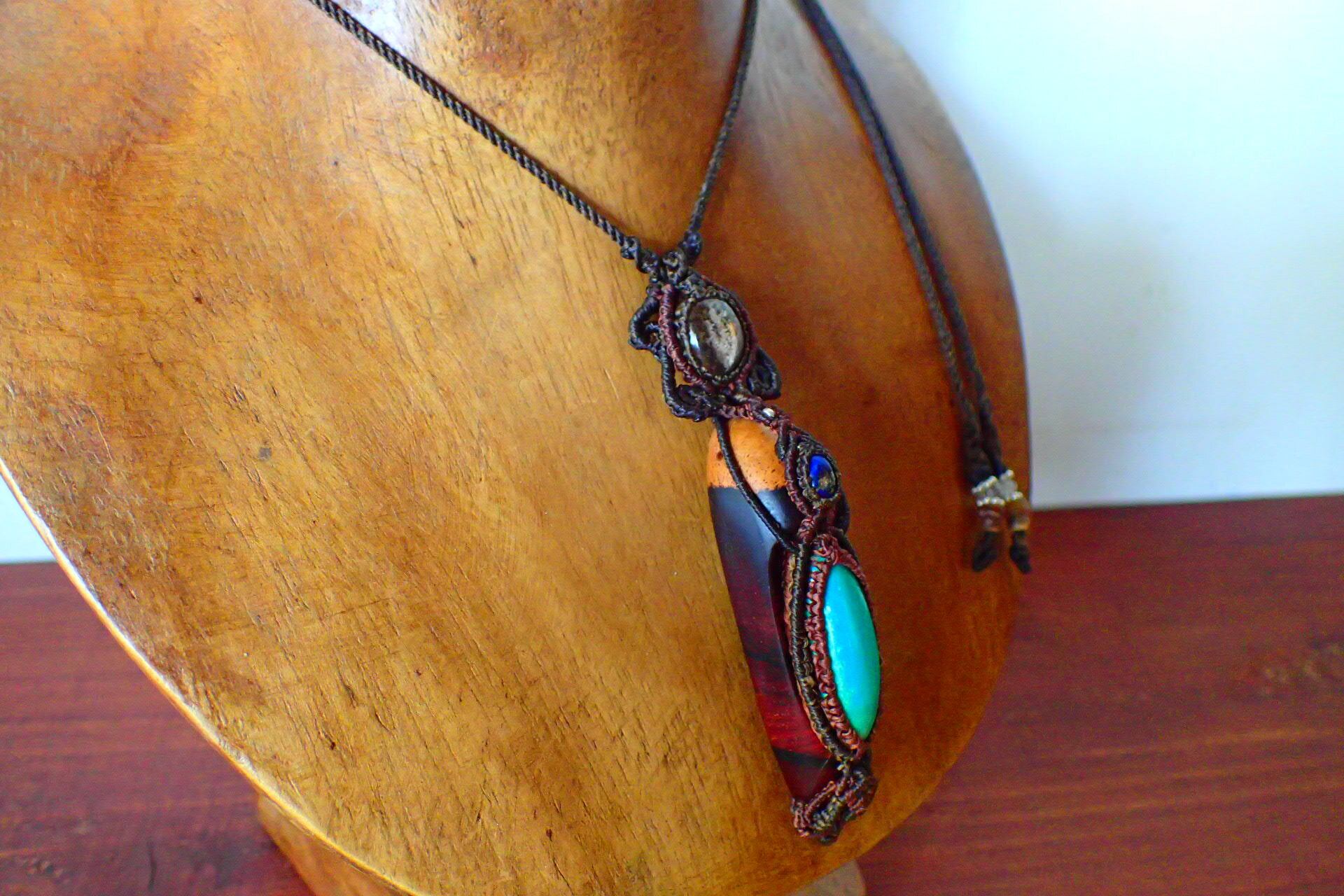 沖縄本島で取れた島桑に、色鮮やかなチベタンのターコイズ、青みと金色のパイライトが美しいラピスラズリと、ガーデンクォーツをマクラメ装飾したペンダントです。