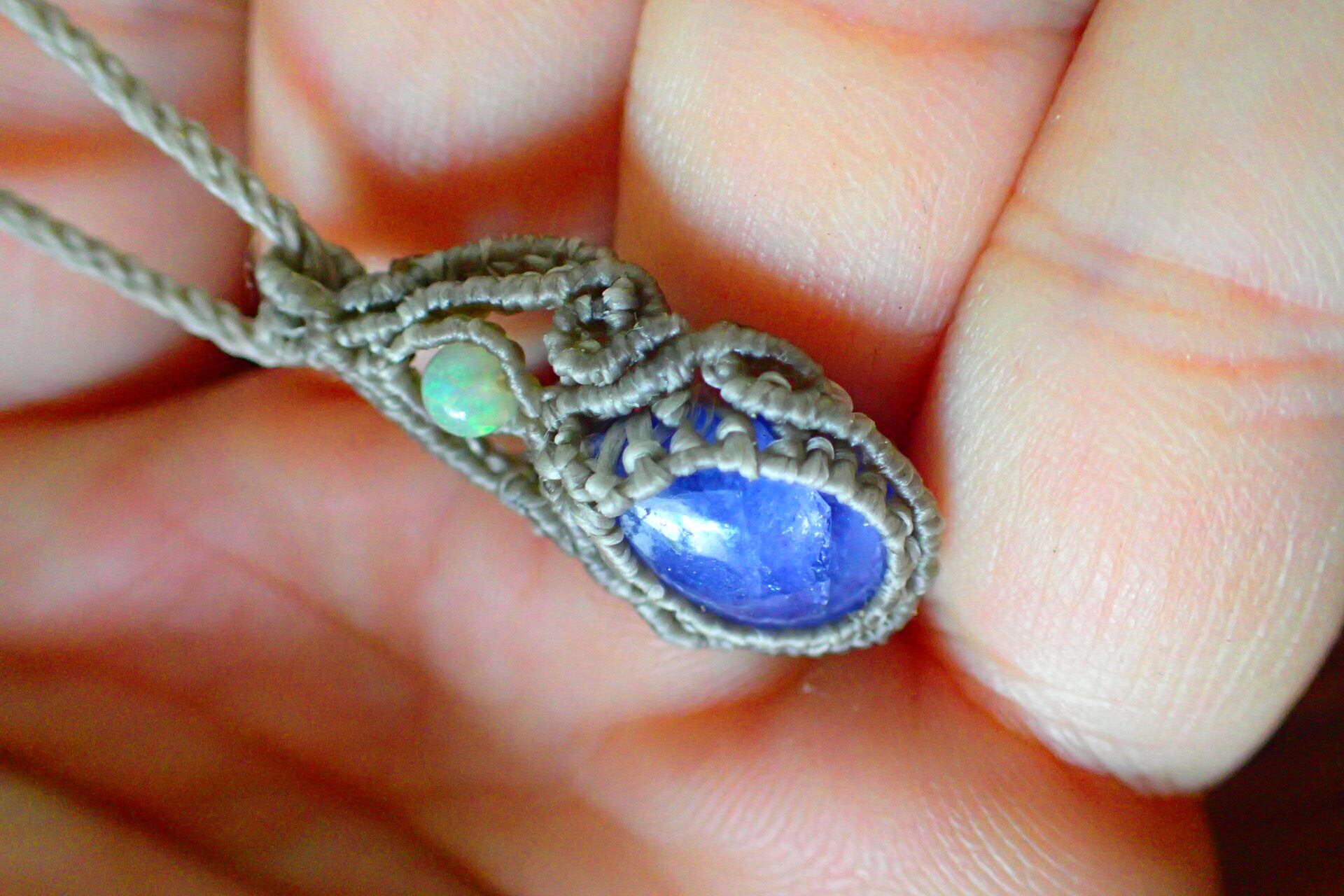 すみれ色の発色が美しいタンザナイトと、息をしているような遊色が特徴のエチオピアンオパールをマクラメ装飾した、ミニペンダントです。