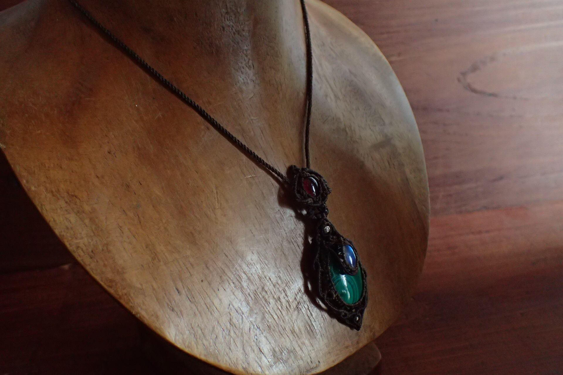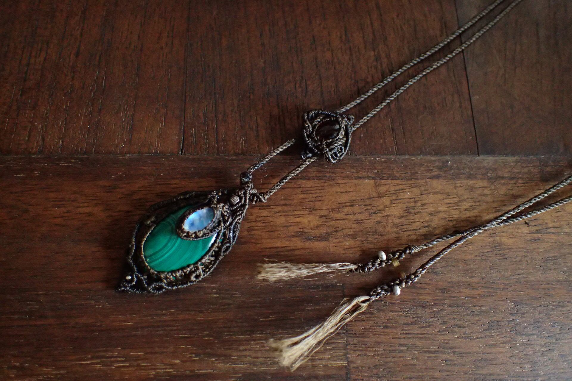 流線模様が美しいマラカイトの上にレインボームーンストーンをON。レースのようなマクラメ編みで、華やかな印象にまとめてみました。