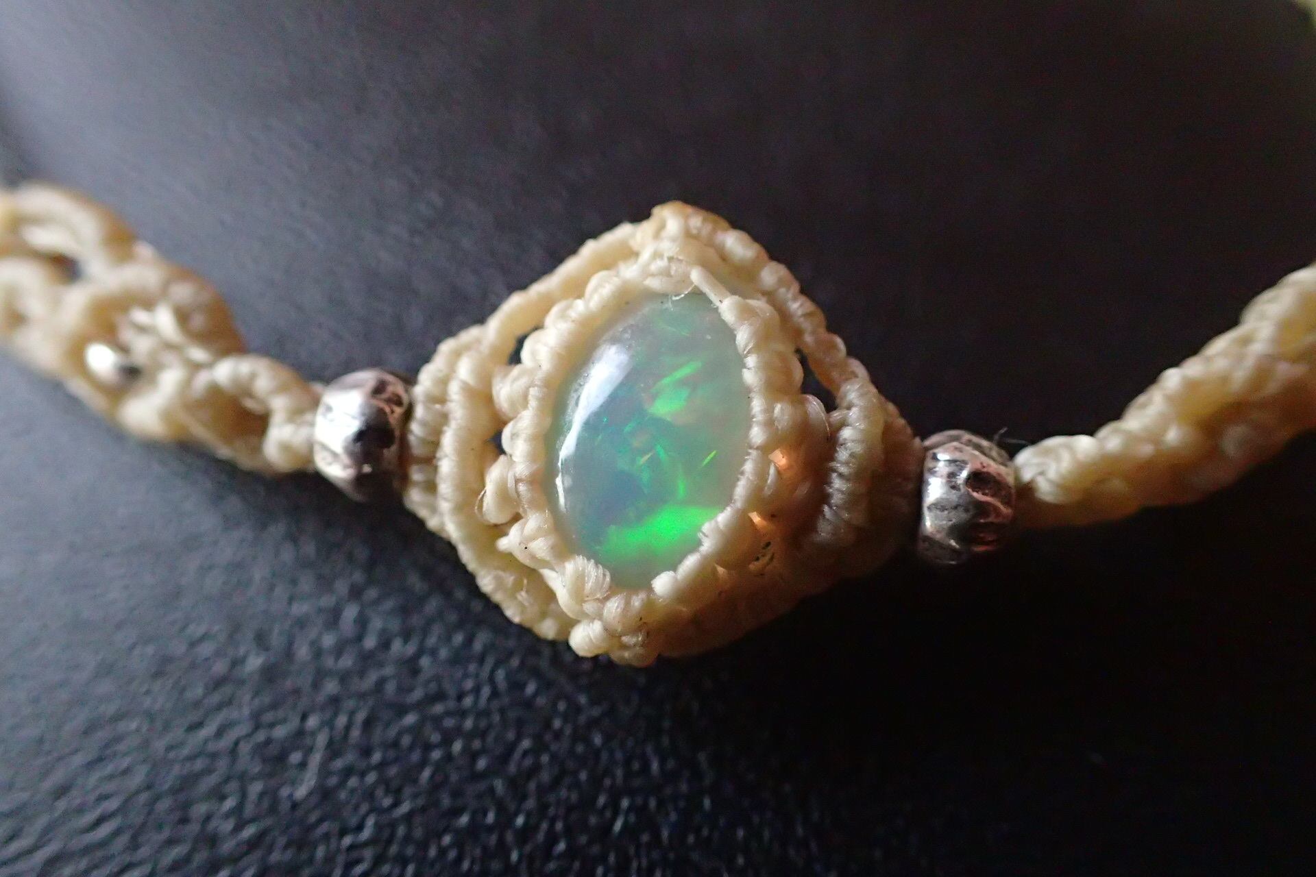 見る角度光の当たり方で、緑や青、赤色などの遊色効果を持つプレシャスオパールをマクラメデザインしたブレスレットです。
