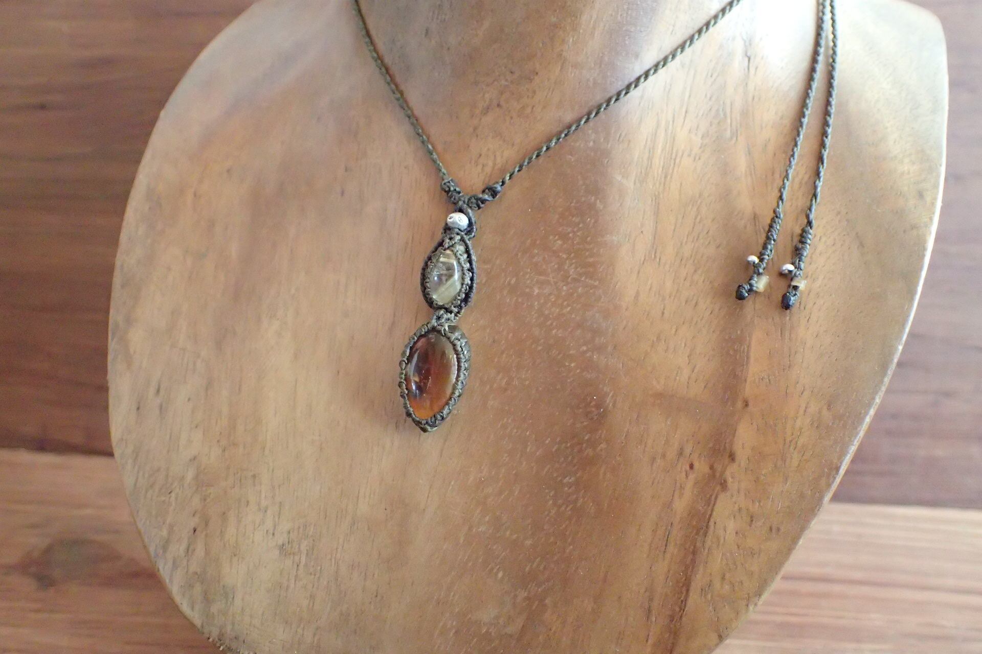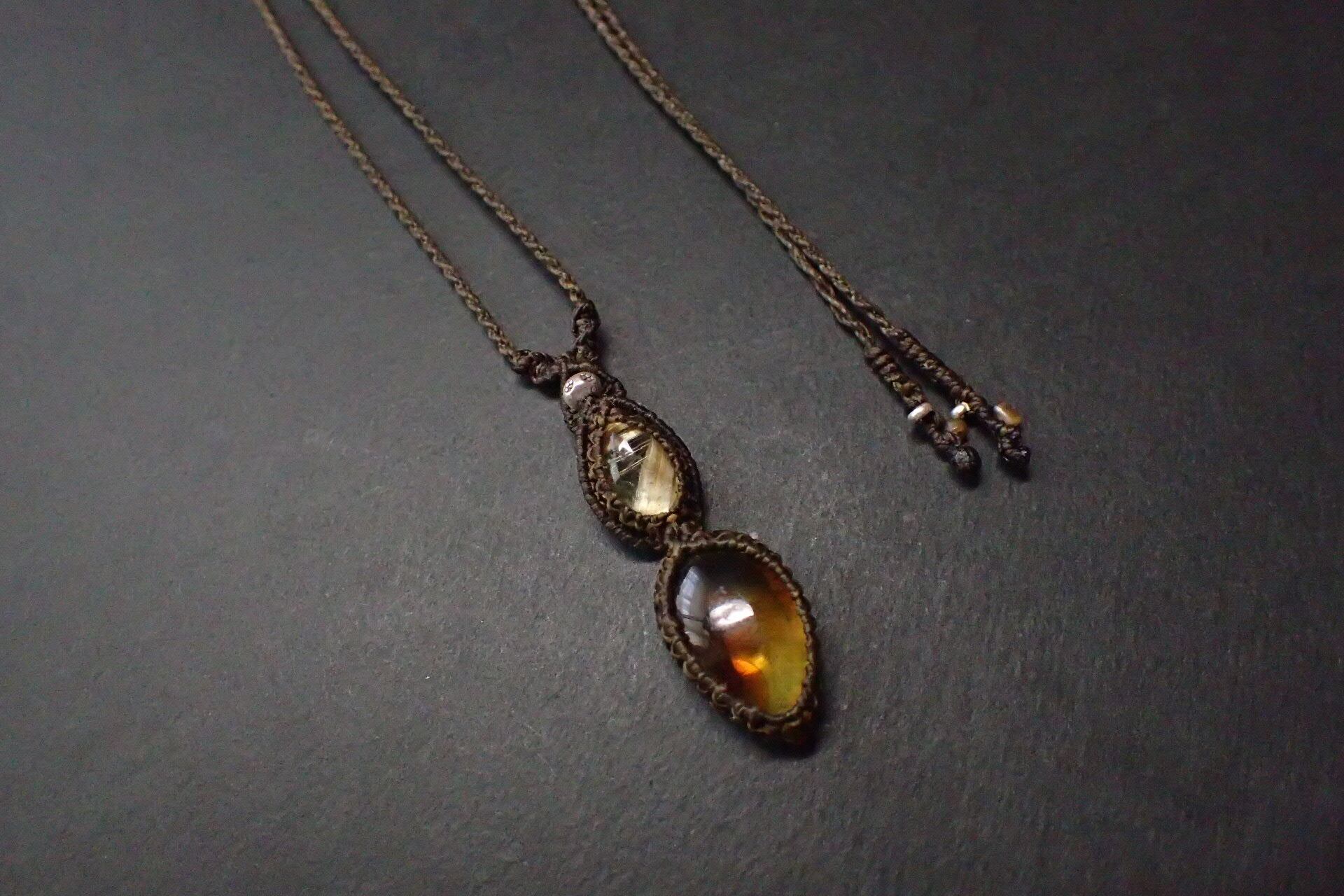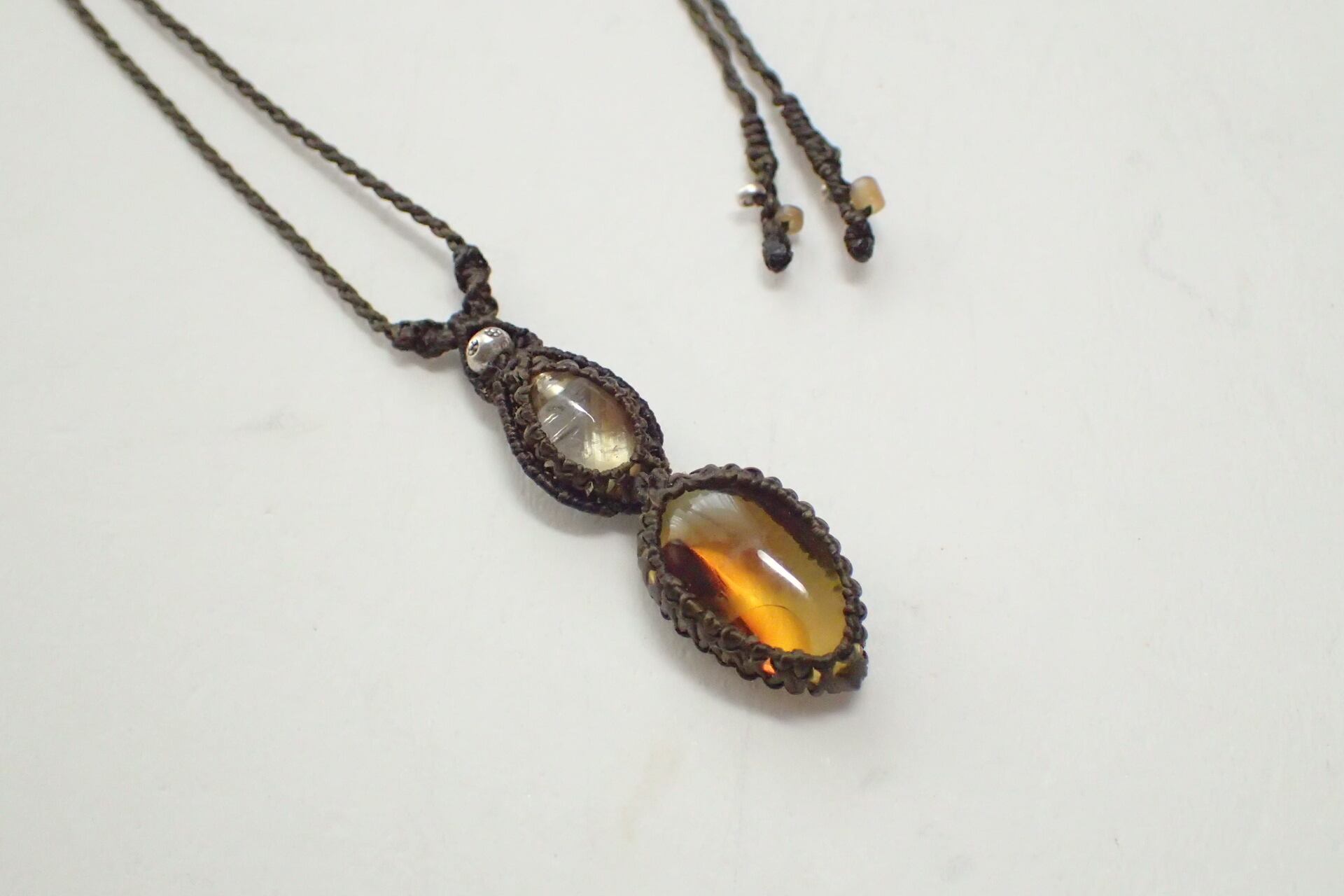 透明感と、明るい茶褐色のきれいに磨き上げられたアンバーと、水晶の中に金鉱石という金色の鉱物が光るルチルクォーツをシンプルにマクラメのペンダントに仕立てました。