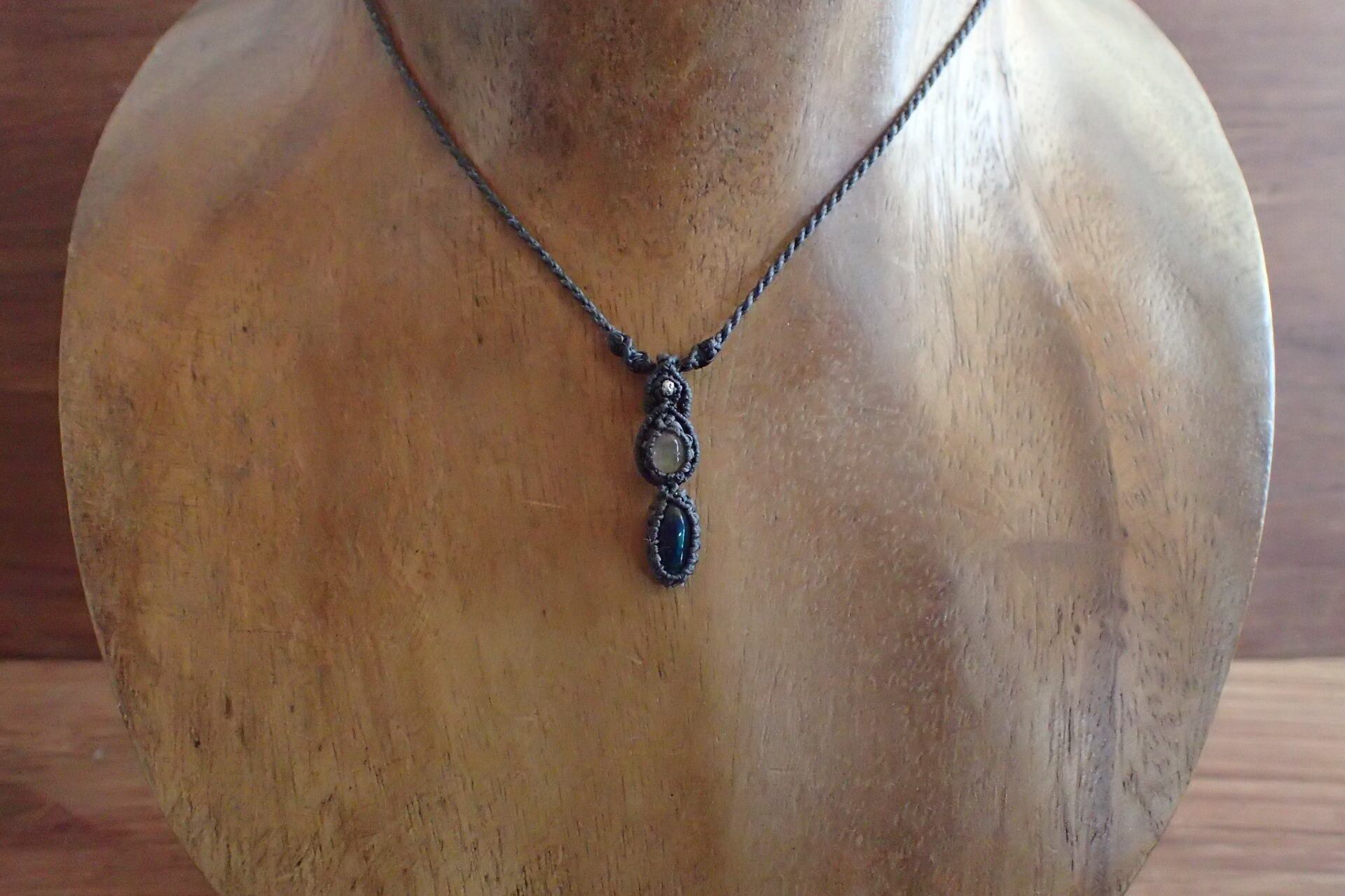 うっすらと透き通るような質感の黒色に角度と、緑、青、赤色の遊色を有するブラックオパールと、同じような質感に、青、赤、緑、黄色の遊色を持つエチオピアンホワイトオパールとをマクラメのシンプルペンダントです。