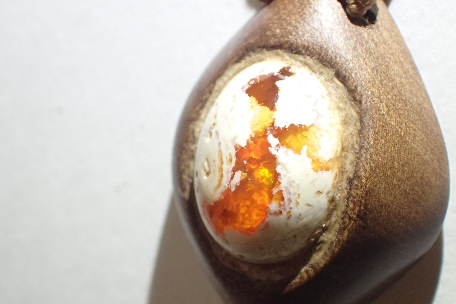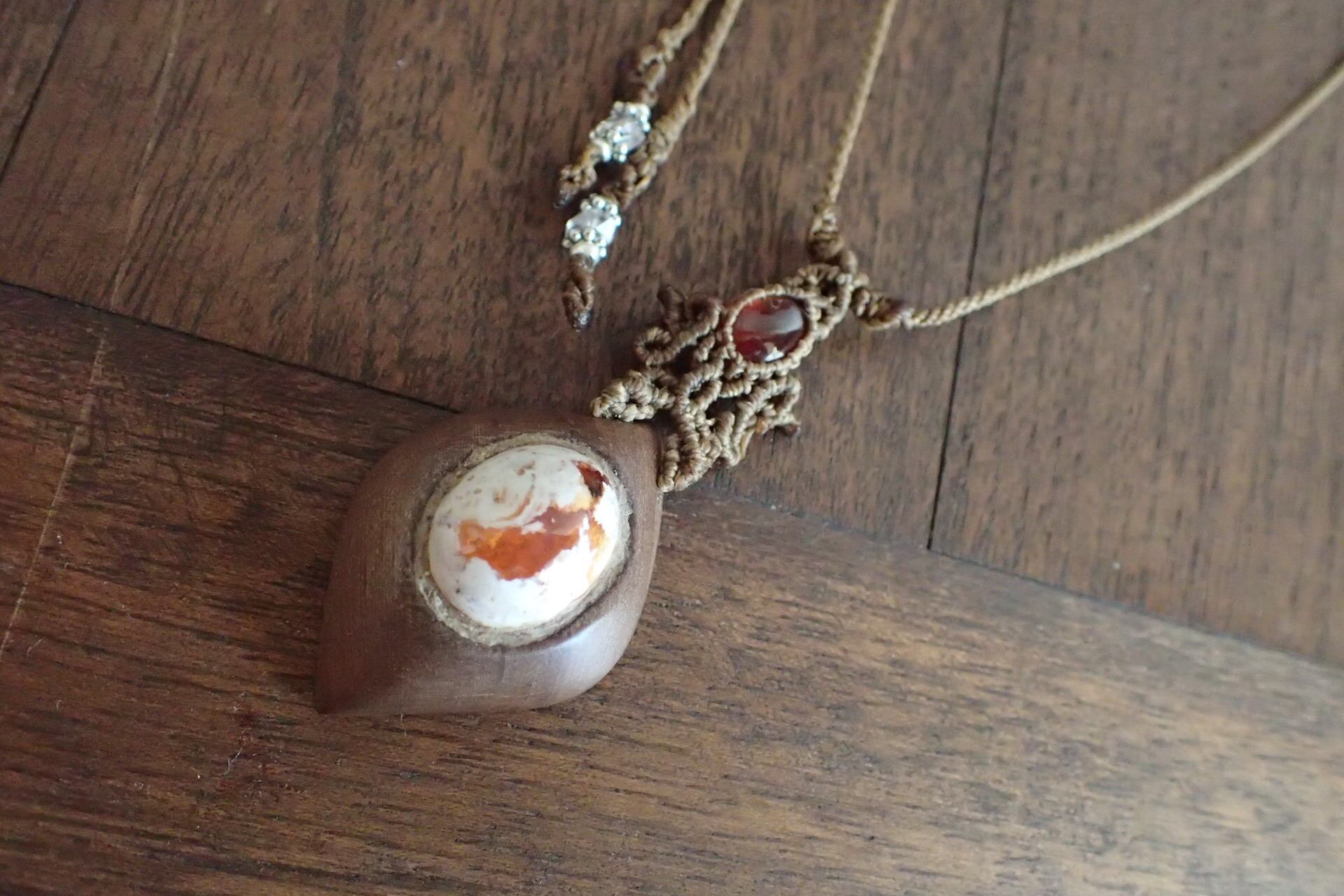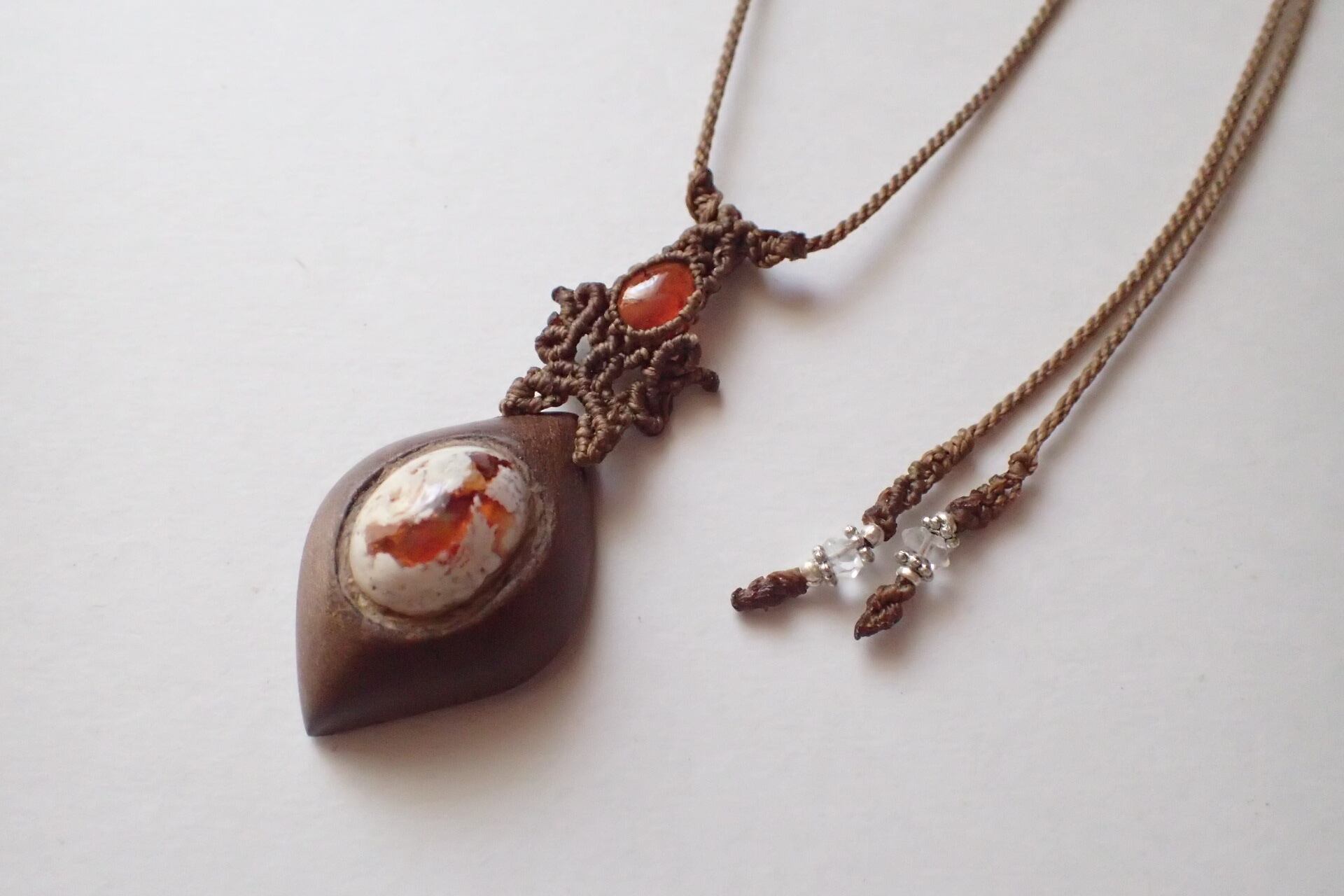 母岩の隙間にできる神秘的な湖のような遊色が浮かぶオパールを、八重山地方に自生するユスの木に、レジンと樹脂粘土を使いはめ込み、オレンジがかった色が特徴的なマンダリンガーネット(スぺサルティンガーネット)を、マクラメで装飾したペンダントです。