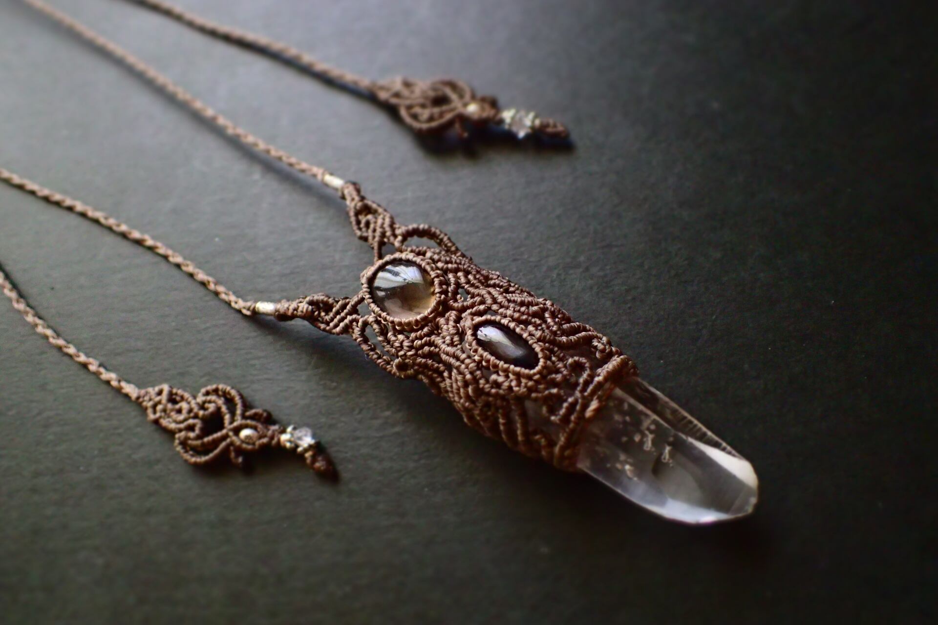 世界最高峰のヒマラヤ山脈で採掘された、透明度と世界有数の浄化効果の高い水晶に、光の反射で十字のキャットヤンシー効果の見られるブラックスターと、薄茶色く透明なスモーキークォーツを、マクラメ装飾し、ワンドタイプに仕上げたネックレスです。